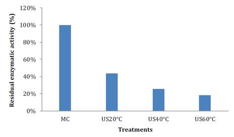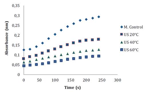 According to Ercan and Soysal (2011) ultrasonic generated heat, and exposure time leading to increased sample temperatures, allow the reduction of POD and PPO activities. When US is combined with temperature, a synergic effect generates enzymatic dissociation of the prosthetic group, significantly decreasing (p<0.05) the content of the structure of the helix/alpha and causing conformational changes in the secondary and tertiary structures of POD and PPO after cavitation effect. This finally leads to partial or total protein denaturation (14, 20, 22).