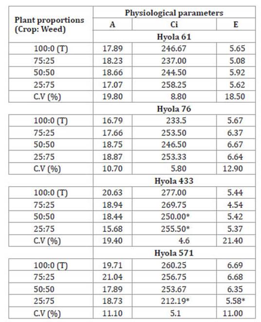 Table 1: Physiological responses of canola (Brassica napus) hybrids under competition with black oat (Avena strigosa), in terms of photosynthesis rate (A), internal CO2 concentration (Ci), and transpiration rate (E) in experiments conducted by the substitutive series method.
