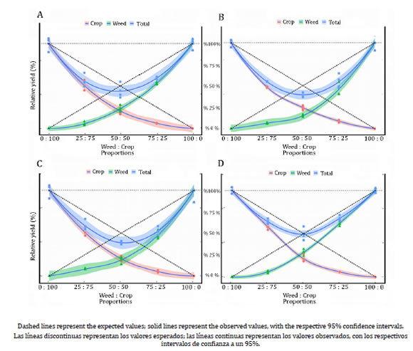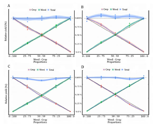 Weeds, if not properly controlled, reduce both grain yield and quality, in addition to hosting insects and diseases and hampering mechanized harvest (17). Experiments with replacement series are used to assess weed interference on crops by helping to understand how distinct plant species perform when grown in a community (26). The development of strategies to minimize the effects of weeds on crops is essential in the agriculture since there is an environmental need to reduce pesticide applications while maintaining high grain yields to guarantee the economic sustainability of farming.
