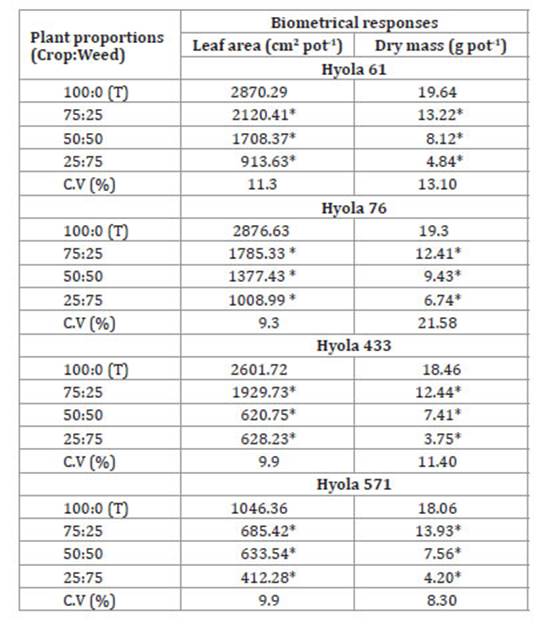 Table 2: Biometrical responses of canola (Brassica napus) hybrids under competition with black oat (Avena strigosa), in terms of leaf area (AF) and dry matter (DM) in experiments conducted by the substitutive series method.