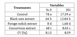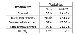The black oat and forage radish extracts cultivated both individually and in combination promoted gains in germination and length of soybean seedlings (Table 1).