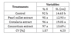Table 2: Seed germination percentage (% G) and seedling length (SL) of corn in the presence of forage aqueous extracts.