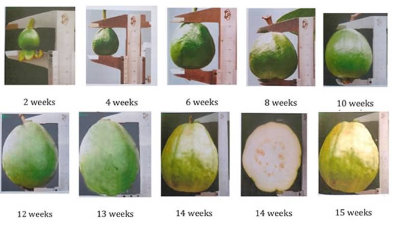 This research examined the ripening time of guava fruit to provide a scientific basis for better harvesting and preservation of these fruits. Biochemical research methods were used to analyse changes in physiological and biochemical parameters according to the growth and development of guava fruit. The fruit took 14 weeks after anthesis to reach its maximum size in terms of length and diameter. The chlorophyll content in guava peel peaked after 10 weeks, decreasing until week 15. The content of carotenoids, which was low at fruit formation, rose rapidly until fruit ripening, while the vitamin C and reducing sugar contents increased continuously and peaked at week 14. A gradual increase was seen in the starch and total organic acid contents from the beginning of fruit formation, with peaks at 10 weeks, followed by a moderate downward trend. The pectin content showed the same trend, as it declined gradually after peaking at 12 weeks. The first 4 weeks showed an increase in the tannin content, which decreased afterward. The study results show that guava fruit should be harvested after physiological maturity and before ripening completely (14 weeks) to ensure that the nutritional value of the fruit is maintained during storage.