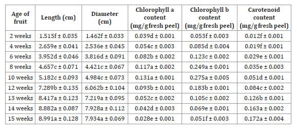 Table 1: Changes in length and diameter of guava fruits and pigment contents in guava peels.