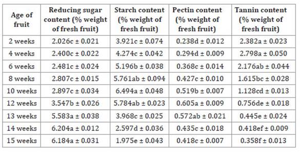 Table 2: Contents of reducing sugar, starch, pectin, and tannin in guava fruits.