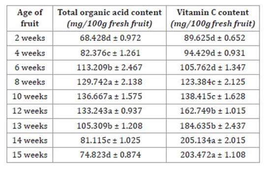 The data in Table 3 show that at the stage when fruit started to develop, the organic acid content was 68.428 mg/100 g fresh fruit.
