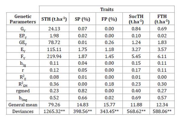 Table 2: General mean, genetic traits, estimated variance components of sugarcane tons per hectare (STH), sucrose tons per hectare (SucTH), fiber tons per hectare (FTH), fiber percentage (FP) and apparent sucrose percentage (SP), evaluated in the agricultural area of Pumaty sugar mill, considering four harvest cycles.