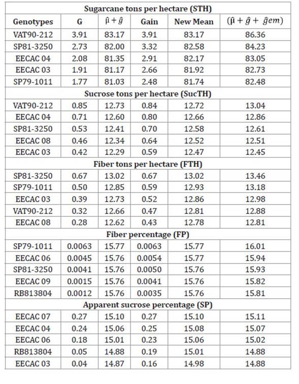 The relative performance of predicted genotypic values (HMRPPGV) on sixteen sugarcane genotypes for sugarcane tons per hectare (STH), sucrose tons per hectare (SucTH), fiber tons per hectare (FTH), fiber percentage (FP) and apparent sucrose percentage (SP) are presented in Table 4.