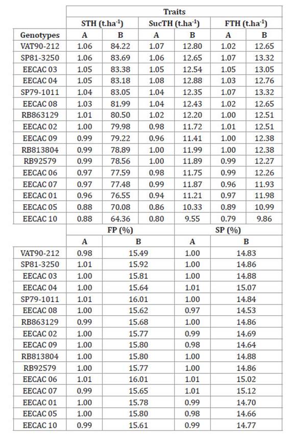 The highest harmonic means for STH were obtained for the genotypes VAT90-212, SP81- 3250, EECAC 03, EECAC 04 and SP79-1011. For SucTH, the highest harmonic means were obtained for EECAC 04, VAT90-212, SP81-3250, EECAC 03 and SP79-1011. For FTH, the genotypes SP81-3250, SP79-1011, EECAC 03, EECAC 04 and EECAC 08 showed the highest harmonic means. For FP, the EECAC 06, SP79-1011, SP81-3250, EECAC 03 and EECAC 09, and finally, for the trait SP, the genotypes EECAC 07, EECAC 06, EECAC 04, EECAC 03 and RB3804 resulted the best.