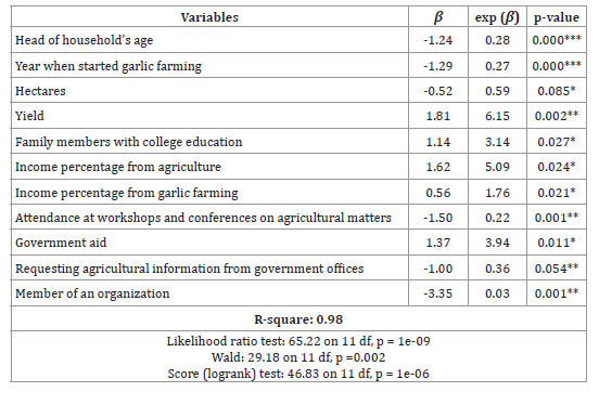 This method allowed construction of the best PH Cox´s model, with eleven covariates associated with adoption of the CEZAC 06 variety among garlic farmers and explained 98% of the variation in adoption time. The predictor based on age increases the probability of adoption by a third (Table 2).