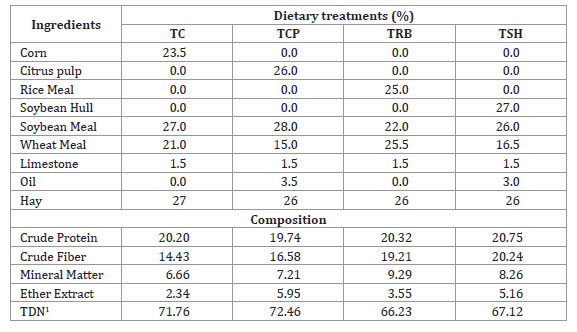 Twenty-four intact ram lambs, Highlander crossbreed, with an average weight of 18 kg + 1,61, were randomly distributed in four dietary treatments (T): corn (TC - control), citrus pulp (TCP), rice bran (TRB), and soybean hulls (TSH). All diets were isoenergetic (71% NDT) and isoproteic (21% CP) (Table 1), Animals were housed in individual pens (1.20 x 1.0 m), with concrete floor covered with wood shavings, equipped with individual feeder and drinker and mineral salt ad libitum.