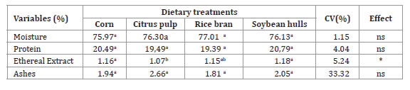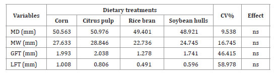 For daily gain means, the citrus pulp diet (0.254 kg/day) and the rice diet (0.175 kg/day) differed from each other (p<0.05) but were statistically similar to corn and soybean hulls. The lowest daily gains for the rice bran treatment can be explained by the reduction in the digestibility of nutrients, especially proteins (12, 30, 33). Tabeidian and Sadeghi (2008), studying different levels of rice bran in lamb diets observed a linear reduction in daily gain with increasing levels of rice bran in the diets.