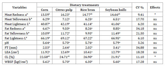 *p<0,05. Las medias seguidas de una letra diferente en la línea difieren estadísticamente entre sí. ns = No significativo (p> = 0,05). FT = espesor de grasa. LEA = área de los ojos del lomo. CL = pérdida de peso por cocinar. WBSF = ternura objetiva