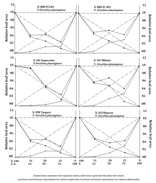 The PRT values (Figure 3) were all lower than 1 with concave lines, indicating that both the crop and the weed were harmed. When studying the effect of weeds on soybean (9) and black beans (12), these studies reported that there were concave lines for the crop and competitor for the leaf area and dry mass, which corroborates our findings. These same authors, assessing the competitive ability of transgenic soybean cultivars with weeds, also reported similar findings for both the leaf area and dry mass. The leaf area showed decreases of up to 48.67% when the crop competed in the proportion of 50:50 with the weed (Table 2), demonstrating that the crop and weed compete for the same environmental resources. Forte et al. (2017) also found similar results.