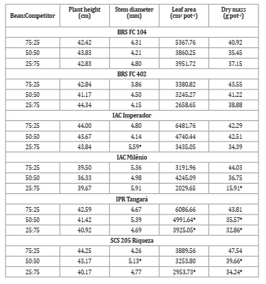 The decreases in stem diameter occurred when the crop and weed were in the proportion of 50:50; BRS FC 104, IAC Imperador, and IAC Milênio showed a decrease in the stem diameter of 2.09, 12.29, and 2.92%, respectively (Figure 2; Table 2).