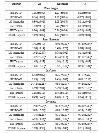 It was found that there were differences in relation to CR, K, and A when beans coexisted with Alexandergrass. Only in one situation did the weed show a higher CR, K, and A than the crop, and only for stem diameter (Table 3). When placed in competition with wild genotypes, domesticated species tend to have a higher relative productivity (12, 20).