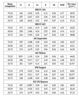 In general terms (Table 4), most bean cultivars tended to increase the photosynthesis rate as the proportion of the competitior was also increased. Although this is a sign of a superior competitive ability, it is not the determing factor in choosing carioca bean cultivars with a superior competitive ability against Alexandergrass. Superior water conductance was reported for IAC Imperador, IPR Tangará, and SCS 205 Riqueza. Cultivars IAC Imperador and SCS 205 Riqueza tended to have an overall superior physiological performance in the competition with Alexandergrass. On the down side, IAC Milênio tended to present a lower photosynthetic rate coupled to a superior internal CO2 as well as a lower carboxilative efficiency (Table 4), making it the worst performing cultivar with regard to the physiological aspects.