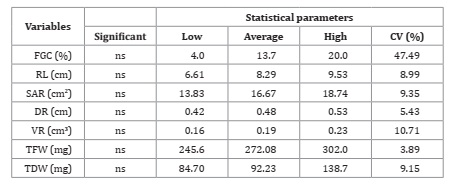 Table 2 contains the descriptive statistics: mean and extreme values, and coefficient of variation for first germination count (FGC), root length (RL), root superficial area (SARS), root diameter (DR), root volume (VRS), seedling fresh weight (TFW) seedling dry weight (TDW).
