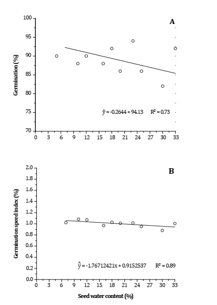 Figure 2: Germination percentage (A) and germination speed index (B) of Phoneix roebelenii seeds as a function of seed water content.