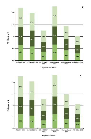sida. The lowest values of TL varied from 0.26 to 0.61 plants m-2 for cultivars DM 5958, Brasmax