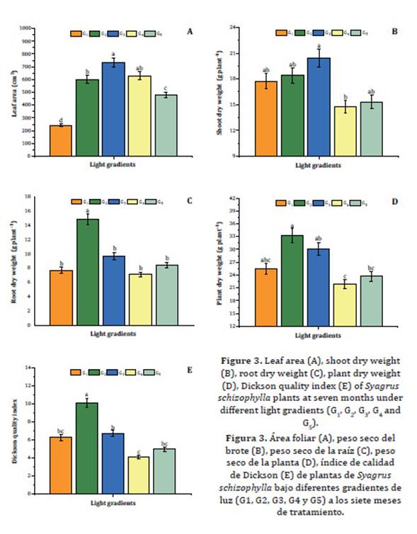 ornamental palm, grown under five light gradients. The treatments were: G1