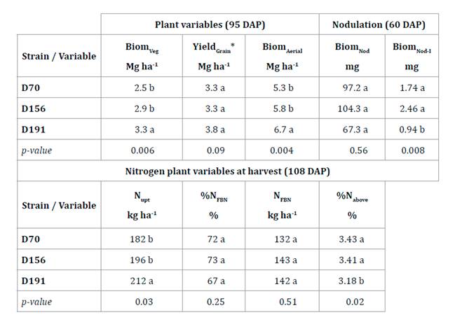 D191 tuvo más nódulos por planta, mayor biomasa aérea y mayor rendimiento. La