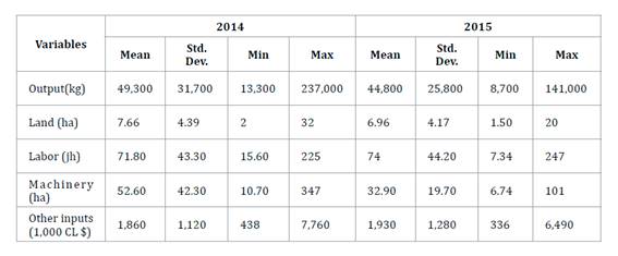 Ñuble, Chile. Usando un panel de 107 agricultores para los años 2014 y 2015, se