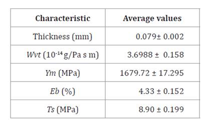The films showed average values of Wvt 3.6988 (10-14 g/Pa s m), tensile