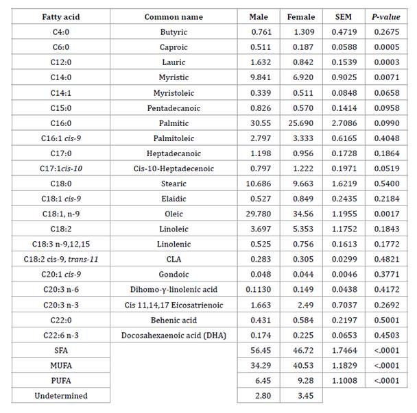 rib and loin weights were higher in males than in females (P≤0.05). Fatty acids