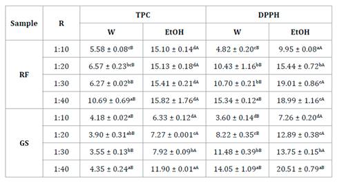 type and the extraction ratio significantly affected TPC and DPPH of GS and RF