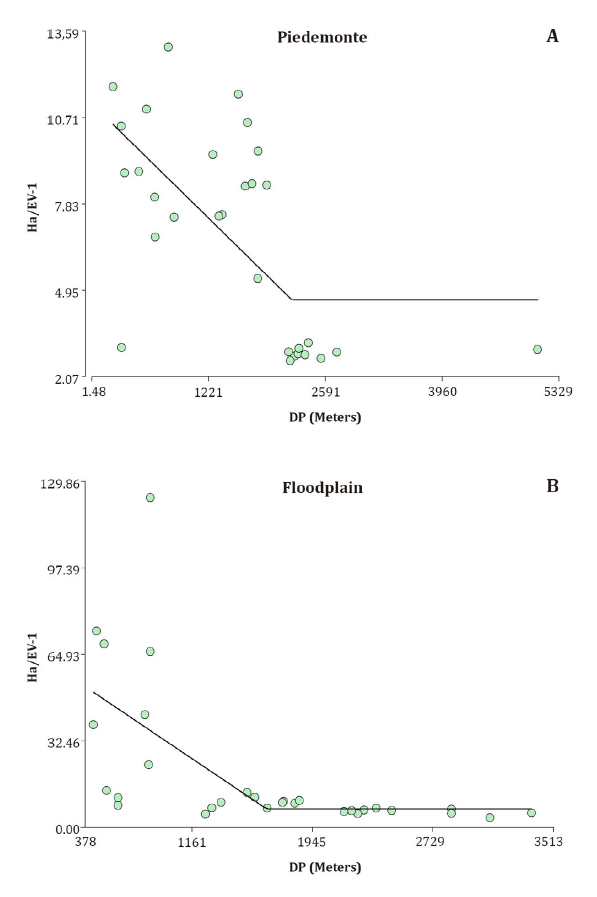 efectuó un modelo de la relación entre la distancia a la fuente de agua y la