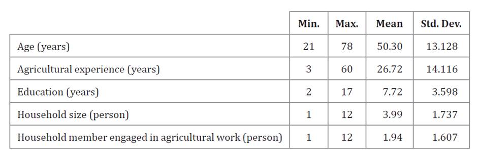 Table 1 shows general characteristics of farmers. Average age was 50 years old, with the youngest farmer being 21 and the oldest farmer being 78 years old. On average, farmers had approximately eight years of education and 27 years of experience. Additionally, average household size was four people, with two individuals from each family engaged in agricultural work.