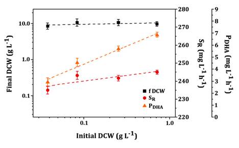 Figure 1. Final dry cell concentration (fDCW), SR, and PDHA vs. initial dry cell concentration (iDCW) for Aurantiochytrium sp. in 250 mL batch shake flasks with 100 mL PMG* medium, tested at 150 rpm and 28 ± 2 °C for 120 h.