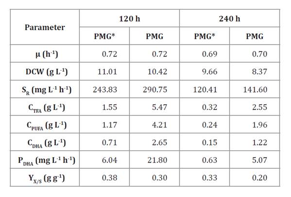 Cell concentration curves obtained with glycerol cultures and PMG medium showed similar behaviors but were slightly higher with PMG. Table 3 shows the main parameters obtained in Aurantiochytrium sp. cultures at 120 and 240 h with PAG and BCG media in batch shake flasks.