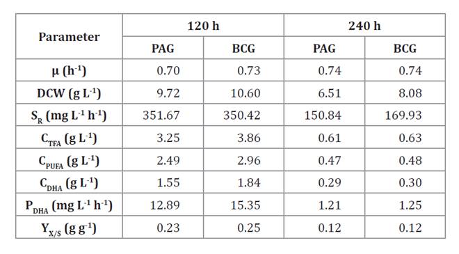 The μ parameters are practically similar for all tests, with values close to those reported with PMG medium, demonstrating that glycerol was an adequate substrate for Aurantiochytrium sp. Concerning DCW, BCG showed the best performance at both culture times, and lower values were observed at 240 h culture, with a decrease of 10 and 24% for PAG and BCG, respectively.