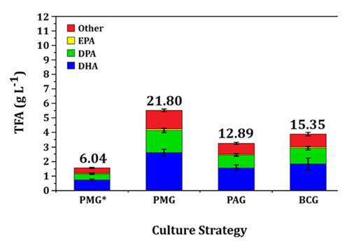 Figure 4. CTFA, as concentration of DHA, DPA, EPA, and other fatty acids, obtained in Aurantiochytrium sp. cultures in 250 mL batch shake flasks with 100 mL media, tested at 150 rpm and 28 ± 2 °C for 120 h culture time.
