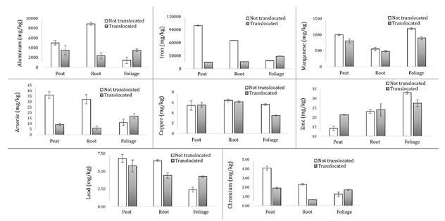 traslocación de metales. La cuantificación de Al, Fe y Mn en turba, tejido