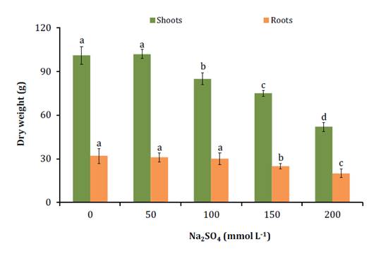 Figure 1. Dry matter of aerial part and roots of Neltuma ruscifolia seedlings grown hydroponically in increasing concentrations of Na2SO4.
