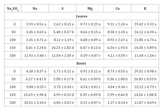 Table 1. Mineral composition (mg g DW-1) in leaves and roots of N. ruscifolia seedlings grown in increasing concentrations of Na2SO4.
