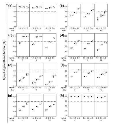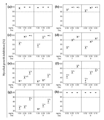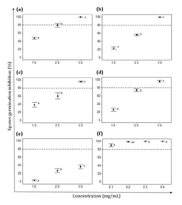 botánicos, inhibición micelial, susceptibilidad conidial