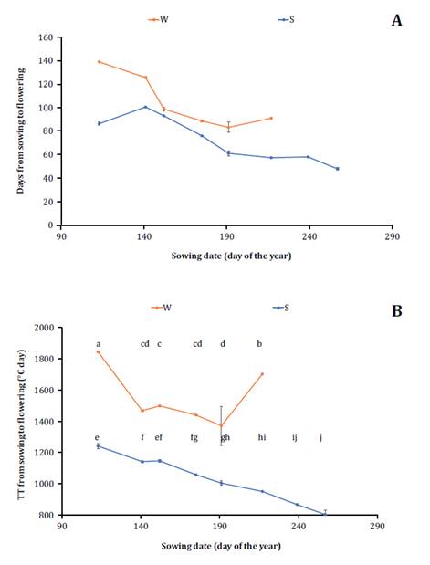 From the fifth sowing date onward, the growth cycle of the winter cultivar changed from shortening to extending because the vernalization requirements were not satisfied. Vernalization-requiring cultivars increase their development rate as temperature accumulates from 4°C to 9°C. From the 250th day of the year (coinciding with the emergence of the winter cultivar sown on the sixth sowing date), a noticeable decrease in the number of days with minimum temperatures below 7 and 9°C was observed (figure 2B). Consequently, the winter variety sown after July did not flower by the time of harvest of the other treatments.