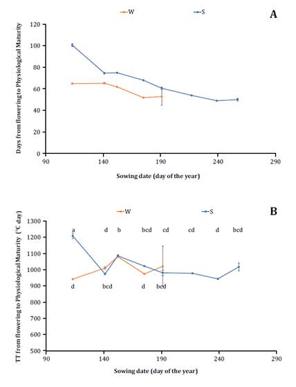 Figure 4. Duration of the period from Flowering to Physiological Maturity expressed in days 4A and in thermal time 4B for two cultivars analyzed (winter in red lines and spring in blue lines) and eight sowing dates evaluated expressed according to the day of the year in which were carried out.