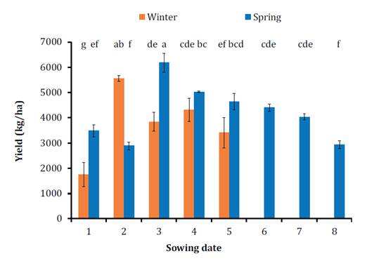 Figure 5. Grain yield expressed in kilograms per hectare on a dry basis for the two cultivars analyzed (winter in orange and spring in blue) and the eight sowing dates evaluated.