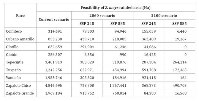 The Olotón race will drastically reduce its area to 16,425 ha. In the concentration pathway scenario 8.5 (SSP 585), the rainfed area of nine maize races will be significantly reduced, with the Olotillo and Olotón races disappearing by the year 2100.