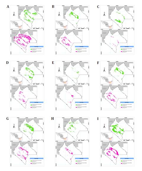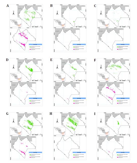 According to the MaxEnt model in the concentration pathway scenario 4.5 (SSP 245), similarly to the 2060 scenario, in the 2100 scenario, all nine maize races will experience a rainfed area reduction (table 1, figure 2).