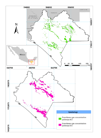 Figura 4. Factibilidad de la superficie de temporal para la raza de maíz Zapalote Chico (Z. mays) para el año 2100 bajo dos escenarios de trayectorias de concentración de gases de efecto invernadero (4.5 y 8.5), en Chiapas, México.