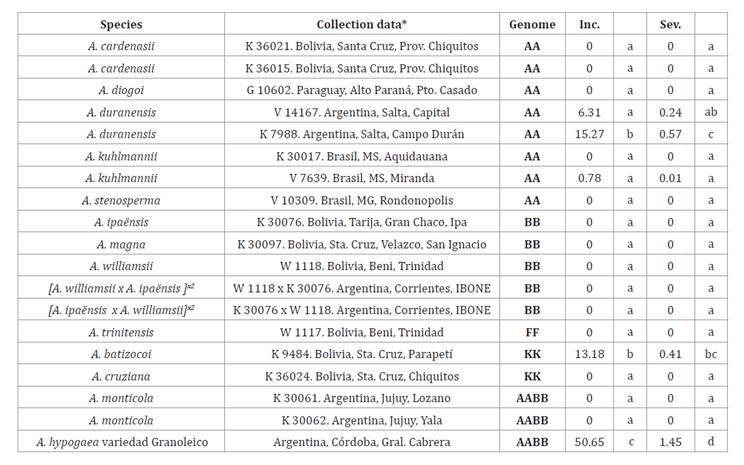 severidad (escala de 0 a 4). Entre las especies con genoma A, A. duranensis presentó