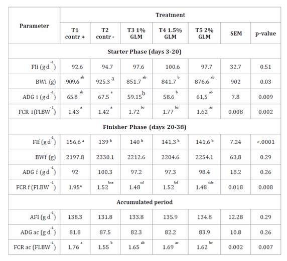 or growth promoters (T2), 1% GLM (T3), 1.5% GLM (T4), and 2% GLM (T5) for 38 d.