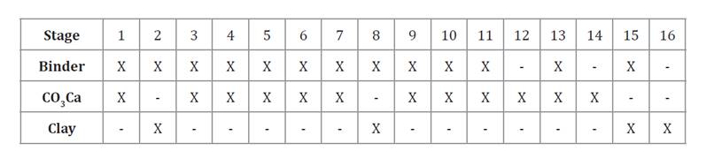 Filler: A 70:30 (w/w) mixture of calcium carbonate and diatomaceous earth (Kangsopa et al. 2018). White clay (kaolin) was used as a surface-smoothing agent (Romo-Campos & Guzmán Valle, 2019). Binder: Gum arabic (25% w/v), a natural water-soluble polysaccharide with a viscosity of 156.7 cP at 25°C, was used. Colorant: A food-grade powder dye was added for visual differentiation. After reviewing literature, it was decided to optimize three independent variables: plate rotational speed (490, 560, and 630 rpm), binder volume (1.6, 2, and 2.4 mL), and stage time (30, 35, and 40 s).