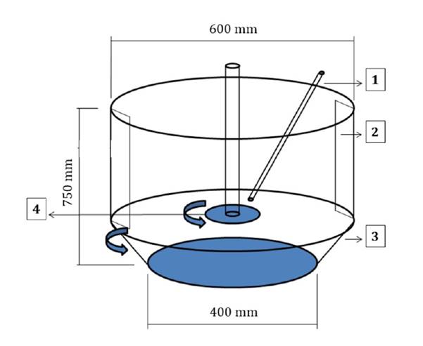 1- liquid pipeline, 2- baffles, 3- rotary coater plate, 4- atomizer disc.